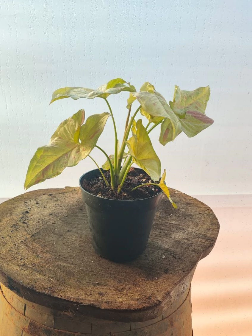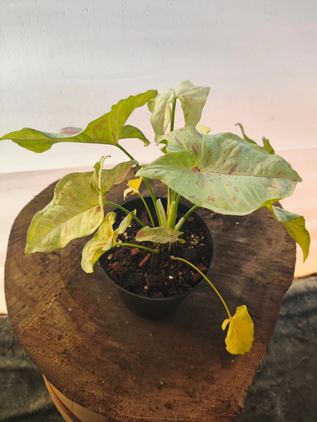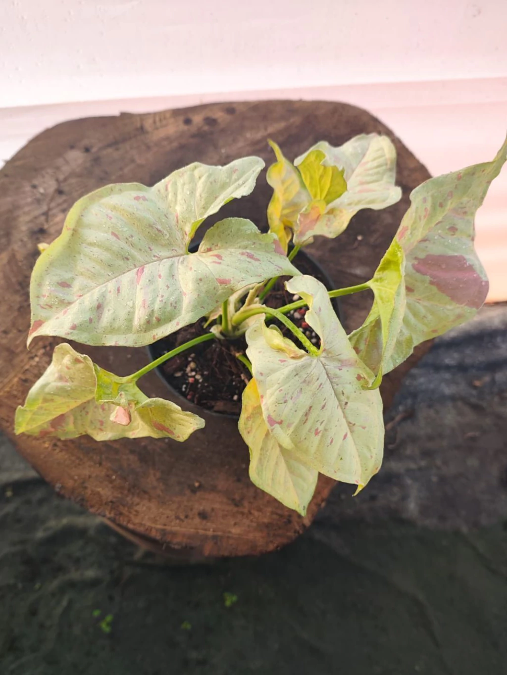 Este cultivar de Syngonium têm folhas pálidas, tons de verde quase brancos com pontos salpicados de rosa (como confete). Seu cultivo é fácil: gosta de boa iluminação mas sem sol forte direto e boa umidade. Uma ótima opção para decoração de interiores ou arranjos.